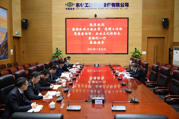 11月24日,中國化學工程集團工會主席、黨委宣傳部長李勝利蒞臨東華科技調研指導黨建工作,公司黨委書記、董事長李立新,黨委副書記、紀委書記桑艷軍,工會主席桂長田出席調研座談會。集團公司黨群工作部業務總經理王文武陪同,東華科技黨務工作部門負責同志參加座談。
