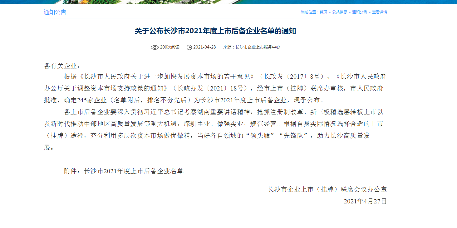 根據(jù)《長沙市人民政府關于進一步加快發(fā)展資本市場的若干意見》(長政發(fā)〔2017〕8號)、《長沙市人民政府辦公廳關于調(diào)整資本市場支持政策的通知》(長政辦發(fā)〔2021〕18號),經(jīng)市上市(掛牌)聯(lián)席辦審核,市人民政府批準,確定245家企業(yè)為長沙市2021年度上市后備企業(yè),其中湖南人健寶固高新科技發(fā)展有限公司是2021年度上市后備企業(yè)中的一員。